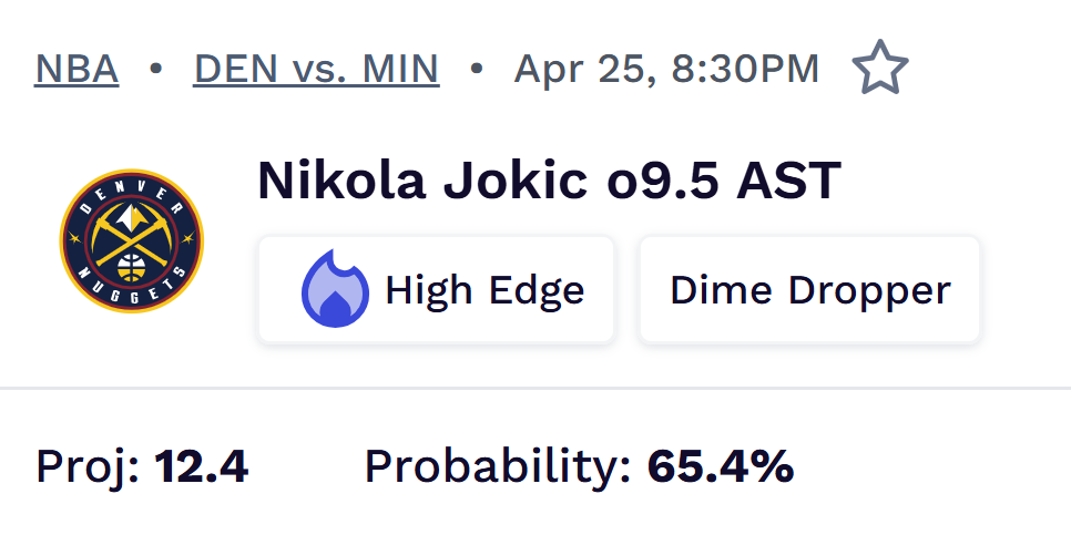 The Dimers model predicts a win for the Nuggets, with a massive 65.4% probability that Jokic clears his standard line of 9.5 assists, giving us a favorable edge at his odds of -111 on Novig, as his fair odds would be -190.