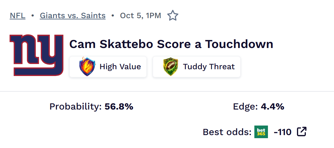 In a favorable spot, Skattebo carries a 53.5% touchdown probability with a 3.5% edge at -110 odds, and he was even at plus money earlier this week.