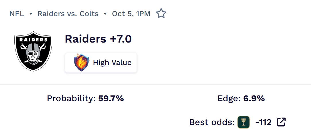 The Raiders sit at +7 against the Colts with a 59.7% probability and 6.9% edge, alongside a projected final of 27-21 in favor of Indianapolis.