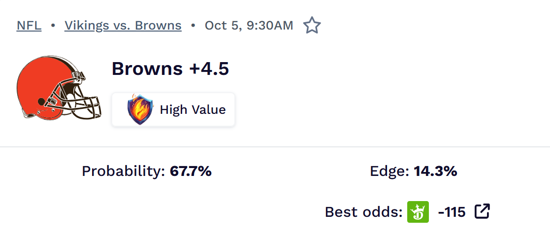 1️⃣ Browns +4.5 (68%) vs. Vikings