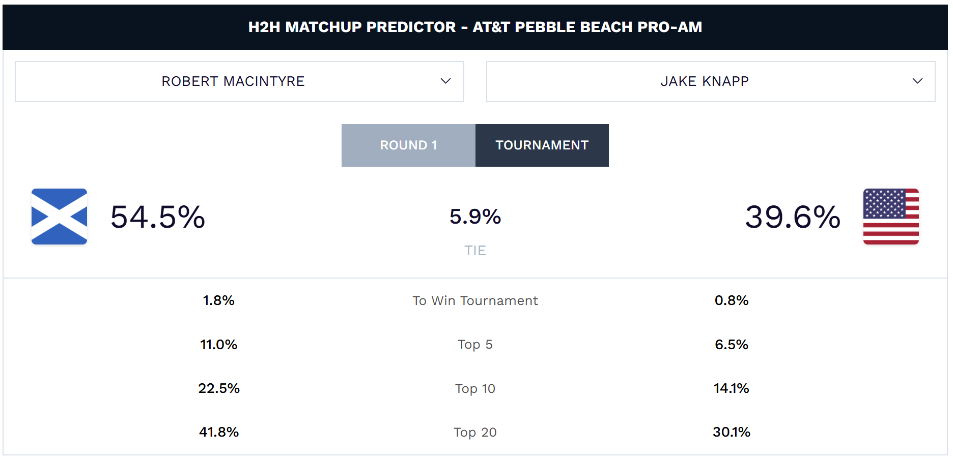 To make this parlay, we'll be using the Head-to-Head matchups available at DraftKings Sportsbook. We'll enter both golfers into our H2H Predictor, select the Tournament-long option, and see which golfer gets the advantage for the weekend.